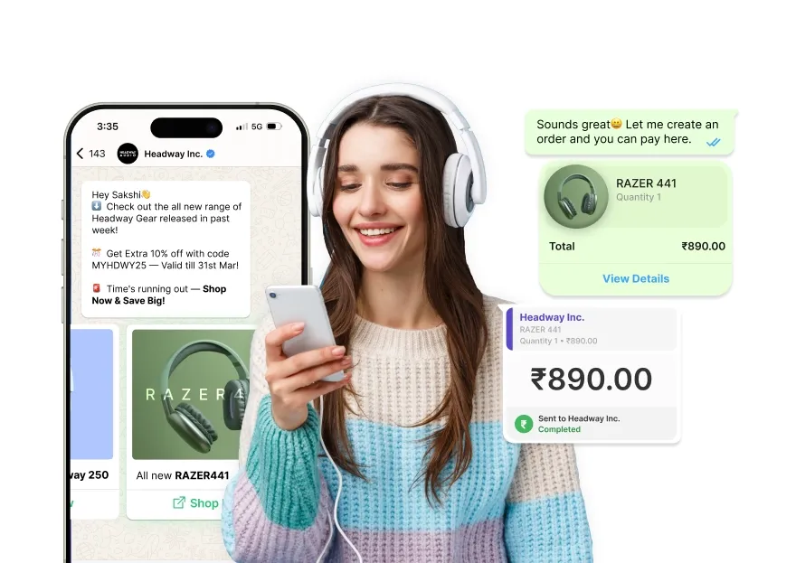 Collect payments via UPI (Paytm, Phonepe, Gpay) Card, Netbanking and more all within WhatsApp. Drive more sales and revenue with native payment flow to collect payment