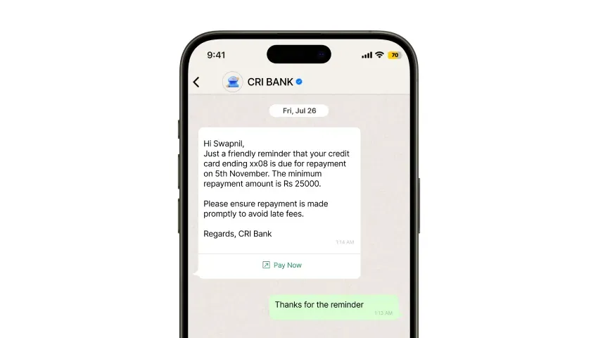 Send automated reminders to customers for bill payments, loan EMIs, and policy renewals via WhatsApp.